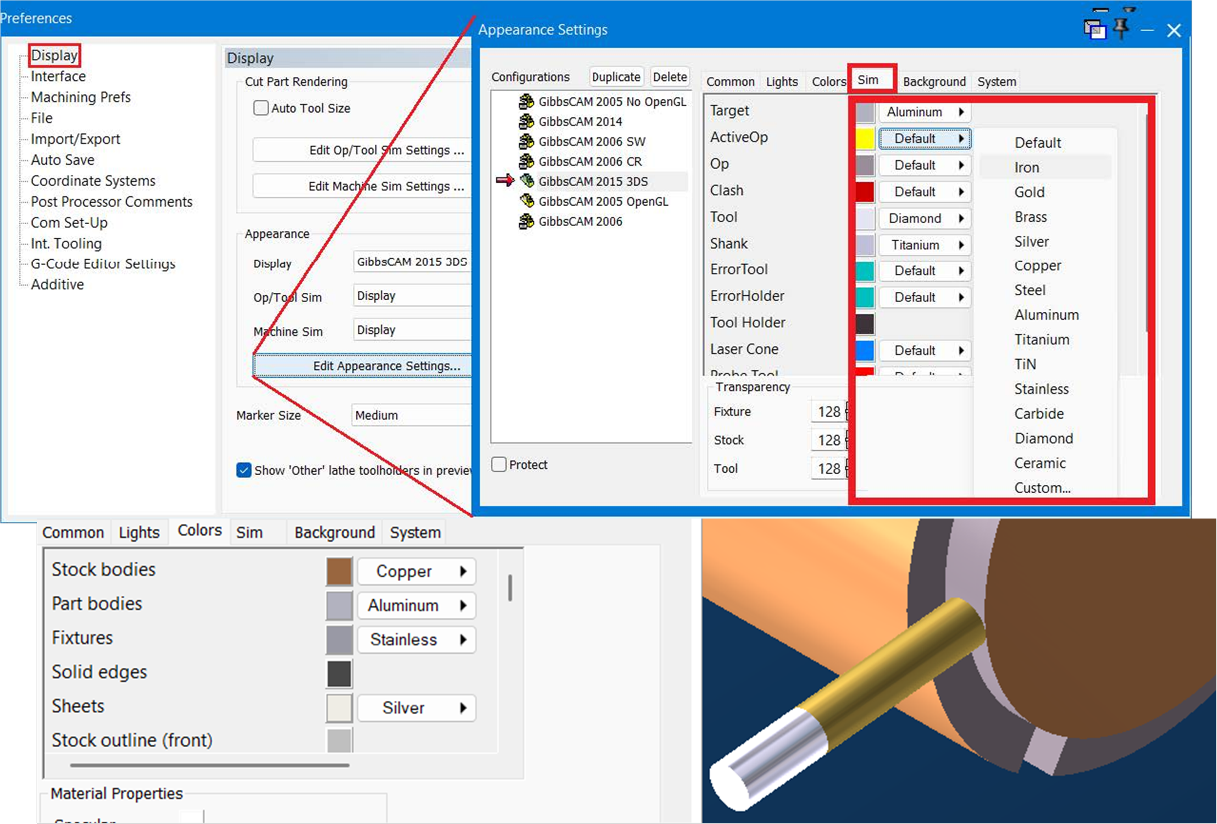 You can now specify not just a color but optionally also a metallic appearance for Simulation items. Use the Colors tab to assign metallic rendering to such items like workpieces, cutting tools/shanks/holders, intermediate tooling, fixtures, etc.; use the Sim tab for such items as Target, ActiveOp, Op, Clash, etc.